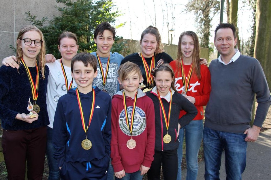 ZIB viel op het BK in de prijzen, met v.l.n.r.: Mona Verburgh, Ellen D'hoore, Ward Denolf, Indra Dereepere, Ella Verburgh, trainer Marco D'hoore, Jasper Masyn, Tiebert Dumon en Lotte Minnebo.